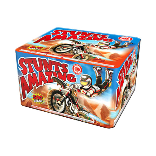 Stunts Amazing is a 33 shot 500g cake from Red Lantern with lots of crackle and effects!