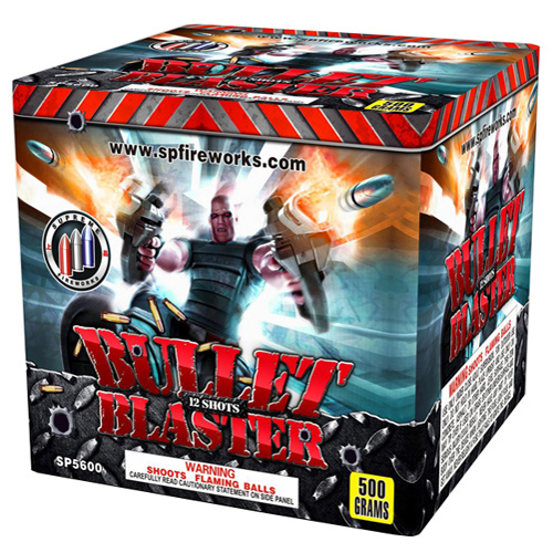 Bullet Blaster 500g cake from Suprem that goes up in single, double and triple pattern. 12 big shots of bright colors, strobes and a crackling finale.