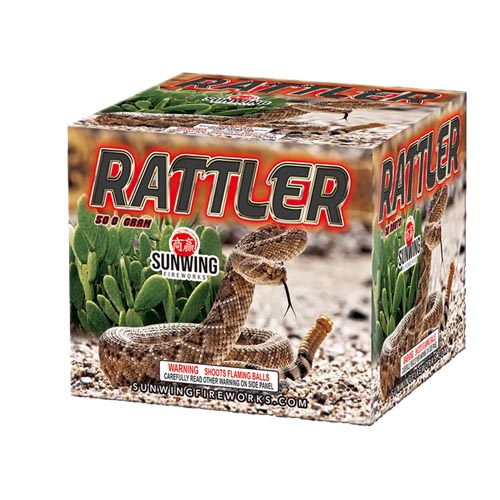 Watch out as this Rattler strikes the sky with crackling tails and single and double shots with color strobes and crackles.