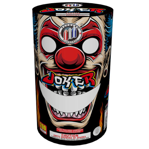Joker is a 2 minute fountain with whistles and crackling ending with the jokers face glowing!