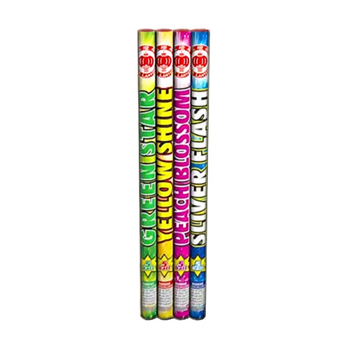 This a 4 pack of large roman candles with big colorful reports. Green Star, Yellow Shine, Peach Blossom and Silver Flash.